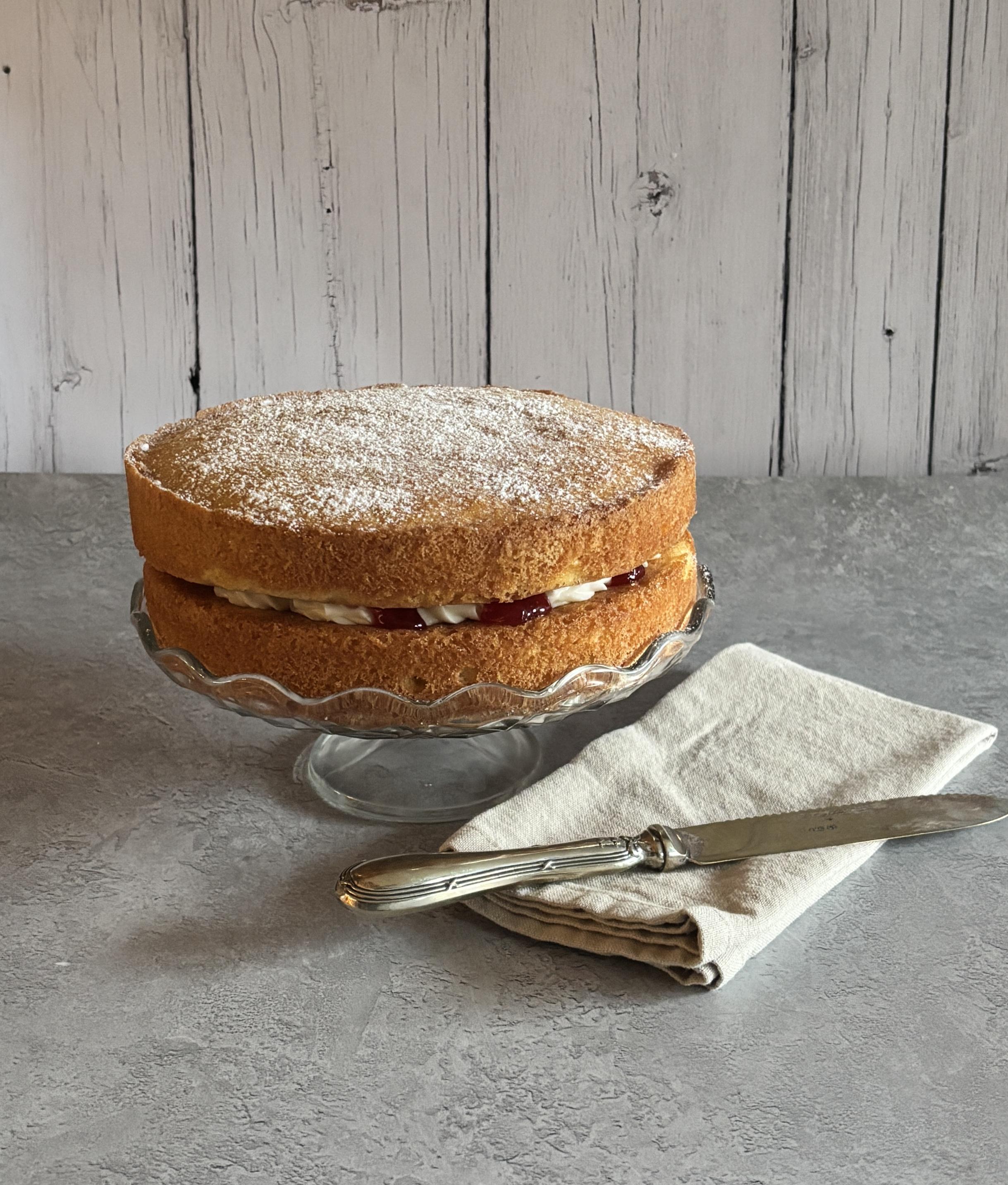Top with the second cake, top-side up. Sprinkle over with caster sugar or icing sugar.